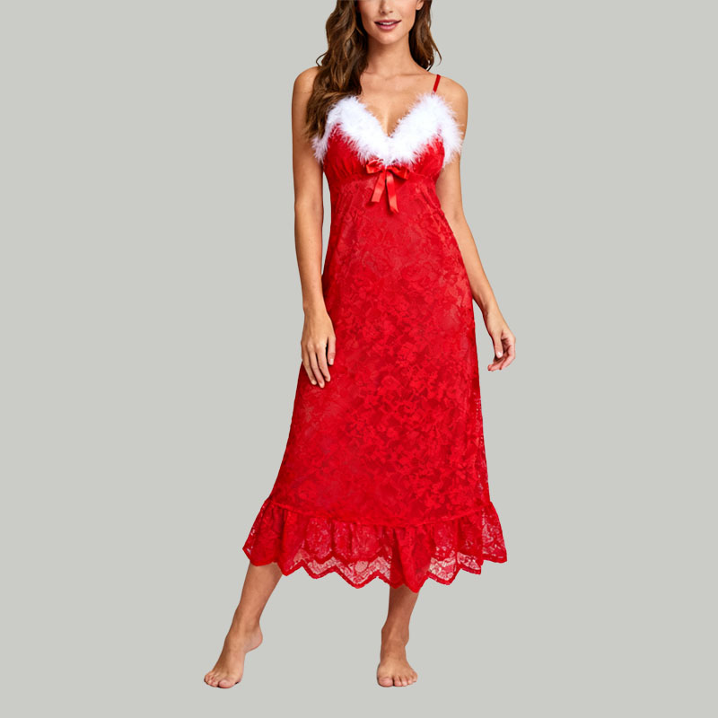 Red Lace Trim Nightgown with Bow V-neck Long Sleep Dress for Women